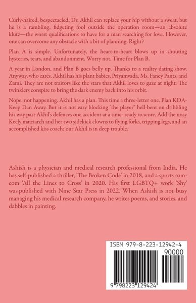 Curly-haired, bespectacled, Dr. Akhil can replace your hip without a sweat, but he is a rambling, fidgeting fool outside the operation room-an absolute klutz-the worst qualifications to have for a man in search of love. However, one can overcome any obstacle with a bit of planning. Right? Plan A is simple. Unfortunately, the heart-to-heart blows up in shouting hysterics, tears, and abandonment. Worry not. Time for Plan B. A year in London, and Plan B goes belly up. Thanks to a reality dating show. Anyway, who cares. Akhil has his plant babies, Priyamvada, Ms. Fancy Pants, and Zami. They are not traitors like the stars that Akhil loves to gaze at night. The twinklers conspire to bring the dark enemy back into his orbit. Nope, not happening. Akhil has a plan. This time a three-letter one. Plan KDA- Keep Dan Away. But it is not easy blocking "the player" hell-bent on dribbling his way past Akhil's defences one accident at a time- ready to score. Add the nosy Keely matriarch and her two sidekick clowns to flying forks, tripping legs, and an accomplished kiss coach; our Akhil is in deep trouble.