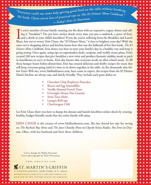 The $5 Dollar Dinner Mom--savings guru, savvy supermarket shopper, and mommy extraordinaire Erin Chase--does it again! With the same fool proof system she used to cut your weekly food budget and put a healthy and delicious $5 meal on the dinner table for your family, she takes it one step further with "The $5 Dollar Dinner Mom Does Breakfast and Lunch". Tailoring her tips at how to size up supermarket deals, clip coupons, and create weekly menu plans, she helps you start your day the right way. With the help of Erin--whether at home or on the go--you can use all the same tools you learned in "The $5 Dollar Dinner Mom Cookbook" to create breakfasts and lunches for less than $5 that are easy and kid-friendly too! Breakfast favorites include: - Chocolate Chip Raspberry Pancakes - Bacon and Egg Quesadillas - Vanilla Almond French Toast - Overnight Honey Nut Granola Lunch favorites include: - Curried Chicken Salad Sandwiches - Swiss Tuna Melts - Lasagna Roll-ups - Chuckwagon Chili And if you are wondering what to do now that breakfast, lunch and dinner are all covered, well don't worry, "The $5 Dinner Mom Does Breakfast and Lunch" also includes a bonus section for $2-4 snacks like pumpkin applesauce and oatmeal cranberry cookies to tide you over in between! Let Erin Chase show you how to have tasty, economical meals, all day, every day.