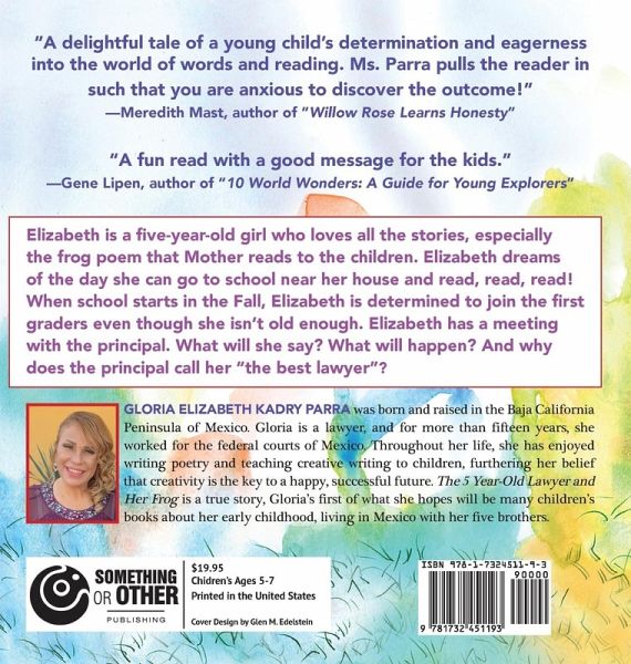 Elizabeth is a five-year-old girl who loves all the stories, especially the frog poem that Mother reads to the children. Elizabeth dreams of the day she can go to school near her house and read, read, read! When school starts in the fall, Elizabeth is determined to join the other first graders even though she isn’t old enough. Elizabeth has a meeting with the principal. What will she say? What will happen? And why does the principal call her "the best lawyer"?