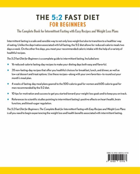 Intermittent fasting is a safe and sensible way not only to lose weight but also to transition to a healthier way of eating. Unlike the deprivation associated with full fasting, the 5:2 diet allows for reduced-calorie meals two days a week. On the other five days, you meet your recommended caloric intake with the help of a variety of healthful recipes. The 5:2 Fast Diet for Beginners is a complete guide to intermittent fasting. Included are: ¿ 16 reduced-calorie fasting-day recipes to make your dieting days both easy and flavorful. ¿ 35 non-fasting-day recipes that offer you healthful choices for breakfast, lunch, and dinner, as well as low-cal dessert and treat options. Use these recipes-along with your own favorites-to round out your month's meal plan. ¿ 4 weeks of fasting-day meal plans geared to the 500-calorie goal for women and 600-calorie goal for men recommended by the 5:2 diet. ¿ 10 tips for motivation and success to get you started toward your weight-loss goals and to keep you on track. ¿ References to scientific studies pointing to intermittent fasting's positive effects on heart health, brain function, and blood-sugar regulation. The 5:2 Fast Diet for Beginners: The Complete Book for Intermittent Fasting with Easy Recipes and Weight Loss Plans is all you need to begin experiencing the weight loss and health benefits associated with intermittent fasting.