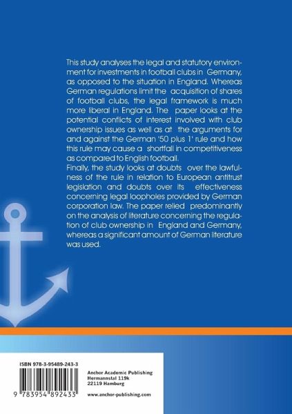 This study analyses the legal and statutory environment for investments in football clubs in Germany, as opposed to the situation in England. Whereas German regulations limit the acquisition of shares of football clubs, the legal framework is much more liberal in England. The paper looks at the potential conflicts of interest involved with club ownership issues as well as at the arguments for and against the German 50 plus 1 rule and how this rule may cause a shortfall in competitiveness as compared to English football. Finally, the study looks at doubts over the lawfulness of the rule in relation to European antitrust legislation and doubts over its effectiveness concerning legal loopholes provided by German corporation law. The paper relied predominantly on the analysis of literature concerning the regulation of club ownership in England and Germany, whereas a significant amount of German literature was used. Essentially, the research found that there is reason for severe scepticism about both the lawfulness and the effectiveness of the 50 plus 1 rule. It would probably not bear up against a test before the European Court of Justice. There are several opportunities in German corporate law to circumvent the rule. Finally, the paper urges the German Football Association (DFB) to consider a softening of the regulations currently in place, and effective modifications of the underlying licensing system, respectively, as well as the introduction of supporters trusts and fit and proper person tests. Finally, the paper claims that competitive balance on a European club level can only be restored if club ownership issues are resolved on a European level.