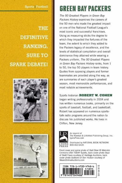 The 50 Greatest Players in Green Bay Packers History examines the careers of the 50 men who made the greatest impact on one of the National Football League's most iconic and successful franchises. Using as measuring sticks the degree to which they impacted the fortunes of the team, the extent to which they added to the Packers legacy of excellence, and the levels of statistical compilation and overall dominance they attained while wearing a Packers uniform, The 50 Greatest Players in Green Bay Packers History ranks, from 1 to 50, the top 50 players in team history. Quotes from opposing players and former teammates are provided along the way, as are summaries of each player's greatest season, most memorable performances, and most notable achievements