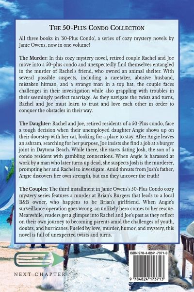 All three books in '50-Plus Condo', a series of cozy mystery novels by Janie Owens, now in one volume! The Murder: In this cozy mystery novel, retired couple Rachel and Joe move into a 50-plus condo and unexpectedly find themselves entangled in the murder of Rachel's friend, who owned an animal shelter. With several possible suspects, including a caretaker, abusive husband, mistaken hitman, and a strange man in a top hat, the couple faces challenges in their investigation while also grappling with troubles in their seemingly perfect marriage. As they navigate the twists and turns, Rachel and Joe must learn to trust and love each other in order to conquer the obstacles in their way. The Daughter: Rachel and Joe, retired residents of a 50-Plus condo, face a tough decision when their unemployed daughter Angie shows up on their doorstep with her cat, looking for a place to stay. After Angie leaves an ashram, searching for her purpose, Joe insists she find a job at a burger joint in Daytona Beach. While there, she starts dating Josh, the son of a condo resident with gambling connections. When Angie is harassed at work by a man who later turns up dead, she suspects Josh is the murderer, prompting her and Rachel to investigate. Amid threats from Josh's father, Angie discovers her own strength, but can they uncover the truth? The Couples: The third installment in Janie Owens's 50-Plus Condo cozy mystery series features a murder at Brian's Burgers that leads to a local B&B owner, who happens to be Brian's girlfriend. When Angie's surveillance operation goes wrong, an unlikely hero comes to her rescue. Meanwhile, readers get a glimpse into Rachel and Joe's past as they reflect on their own journey to becoming parents amid the challenges of youth, doubts, and hurricanes. Fueled by love, murder, humor, and mystery, this novel is full of unexpected twists and turns.