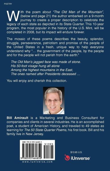 With the poem about "The Old Man of the Mountain", the author embarked on a 9-month journey to create a proper description to celebrate the legacy of each state as depicted in its State Quarter. This 10-year program, the most popular in the history of the U.S. Mint, will be completed in 2008, but its impact will endure forever. The mosaic of these poems describes the beauty, splendor, struggle, perseverance, patriotism and promise of the people of the United States in a fresh, unique way to help everyone understand why ". the government of the people, by the people and for the people will not perish from the earth." The Old Man's jagged face was made of stone. His 50-foot visage hung all alone Among the highest mountains in the East, The ones named after Presidents deceased . "The Old Man of the Mountain" (page 130) You will enjoy and cherish this collection.