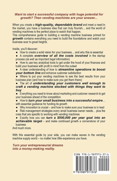 Want to start a successful company with huge potential for growth? Then vending machines are your answer... When you create a high-quality, dependable brand and meet a need in the market, you have a business idea that can truly flourish... and the world of vending machines is the perfect place to watch that happen. This comprehensive guide to building a vending machine business primed for growth contains everything you need to build the foundations and watch your business soar to great heights. Inside, you'll discover: A complete overview of all the costs involved in the startup process (as well as important legal information) How to use key analytical tools to get under the hood of your finances and build your business with profit in mind from the outset A clear understanding of how to streamline operations to boost your bottom line and enhance customer satisfaction Where to put your vending machines to see the best results from your business plan (and how to make sure you get them there) The art of understanding your customers well enough to craft a vending machine stocked with things they want to buy Everything you need to know about marketing and customer research to get your business ahead of the competition Why innovation is crucial - and how to make sure your business is in lead Exactly how you can turn a $500,000 per year goal into an achievable target - and make continued growth a cornerstone of your business And much more. If you're skeptical about whether you can make this work without years of experience or business training behind you, think again. With this essential guide by your side, you can make waves in the vending machine supply world - no matter how little experience you have. Turn your entrepreneurial dreams into a money-making reality: Scroll up and click "Add to Cart" right now!