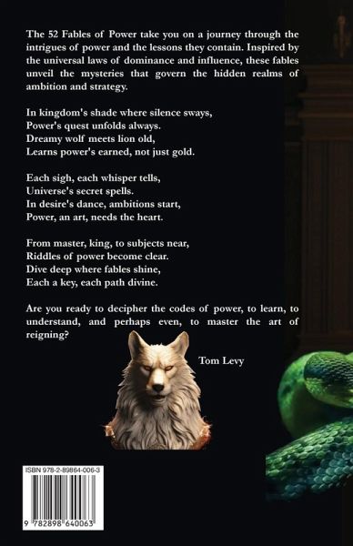 Written in lyrical verse, 'The 52 Fables of Power' takes you on a poetic journey through the intrigues of power and the lessons they contain. Inspired by the universal laws of dominance and influence, these fables unveil the mysteries that govern the hidden realms of ambition and strategy. In kingdom's shade where silence sways, Power's quest unfolds always. Dreamy wolf meets lion old, Learns power's earned, not just gold. Each sigh, each whisper tells, Universe's secret spells. In desire's dance, ambitions start, Power, an art, needs the heart. From master, king, to subjects near, Riddles of power become clear. Dive deep where fables shine, Each a key, each path divine. Are you ready to decipher the codes of power, to learn, to understand, and perhaps even, to master the art of reigning?