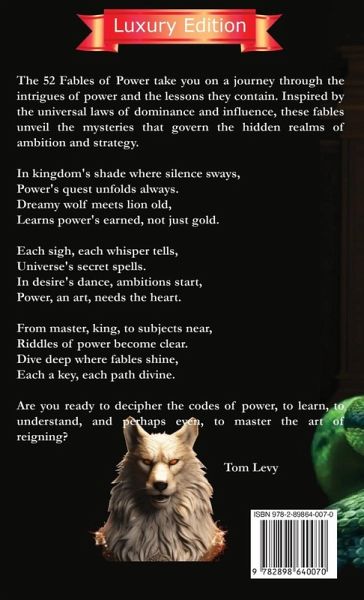 Title: The 52 Fables of Power - Luxury Edition Embark on an extraordinary journey with the "The 52 Fables of Power - Luxury Edition," where poetic verse meets the intricate world of power and ambition. This edition, bound in a high-quality hardcover, transforms each fable into an exquisite literary experience, unveiling the universal laws of dominance and influence in a format that exudes elegance and sophistication. Crafted for the connoisseur of fine literature, this collection delves into the hidden realms of ambition and strategy, brought to life through lyrical storytelling. From the nuances of leadership learned by a dreamy wolf from an old lion to the secret spells of the universe whispered in each fable, this book is a masterclass in the art of power. In kingdom's shade where silence sways, Power's quest unfolds always. Dreamy wolf meets lion old, Learns power's earned, not just gold. Each sigh, each whisper tells, Universe's secret spells. In desire's dance, ambitions start, Power, an art, needs the heart. From master, king, to subjects near, Riddles of power become clear. Dive deep where fables shine, Each a key, each path divine. In this luxury edition, readers will find themselves immersed in a world where each fable is not just a story, but a profound lesson in power dynamics. The exquisite hardcover design ensures this book stands as a timeless piece in any collection, while the captivating verse within offers invaluable insights into the heart of power and influence. "The 52 Fables of Power - Luxury Edition" is more than a book; it's a journey of discovery for those who seek to decipher the codes of power, understand its complexities, and perhaps even master the art of reigning. It's an ideal treasure for those who appreciate the blend of poetic beauty and strategic wisdom.