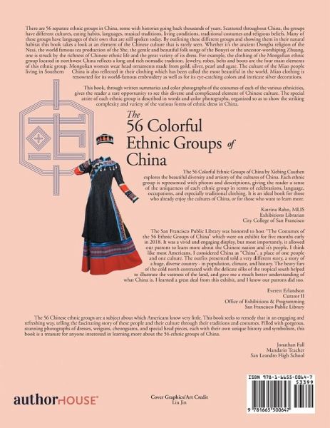 There are 56 separate ethnic groups in China, some with histories going back thousands of years. Scattered throughout China, the groups have different cultures, eating habits, languages, musical traditions, living conditions, traditional costumes and religious beliefs. Many of these groups have languages of their own that are still spoken today. By outlining these different groups and showing them in their natural habitat this book takes a look at an element of the Chinese culture that is rarely seen. Whether it's the ancient Dongba religion of the Naxi, the world famous tea production of the She, the gentle and beautiful folk songs of the Bouyei or the ancestor-worshiping Zhuang, one is struck by the richness of Chinese ethnic life and the great variety of its dress. For example, the clothing of the Mongolian ethnic group located in northwest China reflects a long and rich nomadic tradition. Jewelry, robes, belts and boots are the four main elements of this ethnic group. Mongolian women wear head ornaments made from gold, silver, pearl and agate. The culture of the Miao people living in Southern China is also reflected in their clothing which has been called the most beautiful in the world. Miao clothing is renowned for its world-famous embroidery as well as for its eye-catching colors and intricate silver decorations. This book, through written summaries and color photographs of the costumes of each of the various ethnicities, gives the reader a rare opportunity to see this diverse and complicated element of Chinese culture. The special attire of each ethnic group is described in words and color photographs, organized so as to show the striking complexity and variety of the various forms of ethnic dress in China.