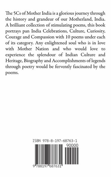 The 5Cs of Mother India is a glorious journey through the history and grandeur of our Motherland, India. A brilliant collection of stimulating poems, this book portrays pan India Celebrations, Culture, Curiosity, Courage and Compassion with 10 poems under each of its category. Any enlightened soul who is in love with Mother Nation and who would love to experience the splendour of Indian Culture and Heritage, Biography and Accomplishments of legends through poetry would be fervently fascinated by the poems.