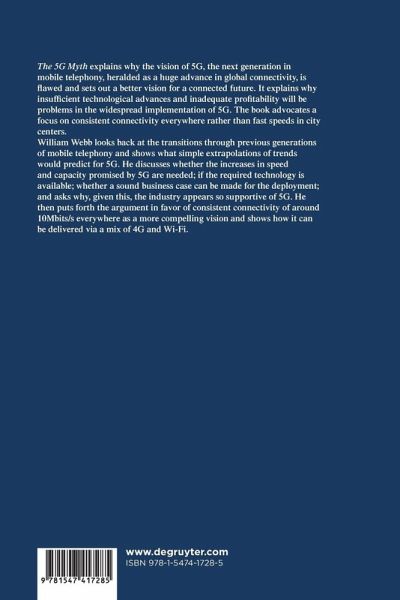 The 5G Myth explains why the vision of 5G, the next generation in mobile telephony, heralded as a huge advance in global connectivity, is flawed and sets out a better vision for a connected future. It explains why insufficient technological advances and inadequate profitability will be problems in the widespread implementation of 5G. The book advocates a focus on consistent connectivity everywhere rather than fast speeds in city centers.