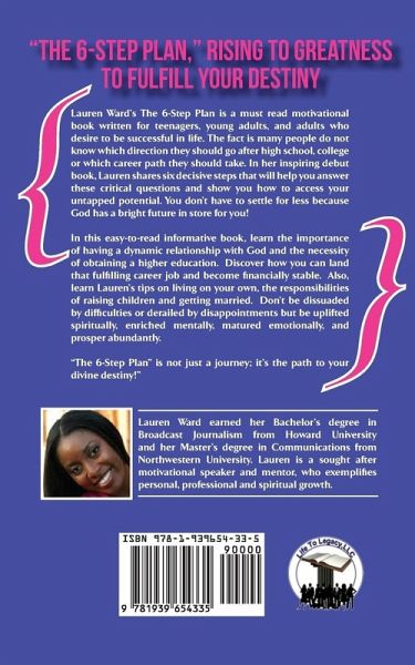 Lauren Ward's The 6-Step Plan is a must read motivational book written for teenagers, young adults, and adults who desire to be successful in life. The fact is, many people do not know which direction they should go after high school, college or which career path they should take. In her inspiring debut book, Lauren shares six decisive steps that will help you answer these critical questions and show you how to access your untapped potential. You don't have to settle for less because God has a bright future in store for you! In this easy-to-read informative book, learn the importance of having a dynamic relationship with God and the necessity of obtaining a higher education. Discover how you can land that fulfilling career job and become financially stable. Also, learn Lauren's tips on living on your own, the responsibilities of raising children and getting married. Don't be dissuaded by difficulties or derailed by disappointments but be uplifted spiritually, enriched mentally, matured emotionally, and prosper abundantly. "The 6-Step Plan" is not just a journey; it's the path to your divine destiny!"
