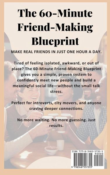 Feel like making friends as an adult is harder than it should be? You're not alone-and it's not your fault. Between busy schedules, new cities, and social anxiety, forming genuine friendships in adulthood can feel overwhelming. But what if you could change that in just 60 minutes a day? The 60-Minute Friend-Making Blueprint offers a simple, practical roadmap to help you confidently meet new people, spark meaningful conversations, and build a social circle you genuinely enjoy. Whether you're an introvert, new in town, or just ready to upgrade your social life, this guide shows you exactly how. Inside, you'll discover: * A proven step-by-step system to build lasting friendships * Strategies to overcome social anxiety and awkwardness * Easy daily routines to meet like-minded people anywhere * Conversation scripts, follow-up tactics, and real-world examples * Guidance for shy beginners and seasoned socializers alike No fluff. No vague advice. Just actionable strategies that work. If you're tired of feeling isolated and ready to create a thriving, meaningful social life-this book is your shortcut. Grab your copy now and start building real connections in just one hour a day!