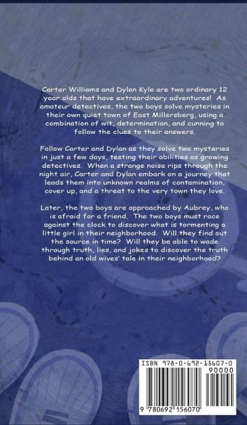 Carter Williams and Dylan Kyle are two ordinary 12 year olds that have extraordinary adventures! As amateur detectives, the two boys solve mysteries in their own quiet town of East Millersberg, using a combination of wit, determination, and cunning to follow the clues to their answers. Follow Carter and Dylan as they solve two mysteries in just a few days, testing their abilities as growing detectives. When a strange noise rips through the night air, Carter and Dylan embark on a journey that leads them into unknown realms of contamination, cover up, and a threat to the very town they love. Later, the two boys are approached by Aubrey, who is afraid for a friend. The two boys must race against the clock to discover what is tormenting a little girl in their neighborhood. Will they find out the source in time? Will they be able to wade through truth, lies, and jokes to discover the truth behind an old wives’ tale in their neighborhood?