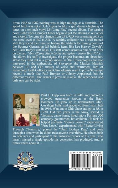 From 1948 to 1982 nothing was as high mileage as a turntable. The speed limit was set at 331/3 rpms to take a spin down a highway of tunes on a ten-inch vinyl LP (Long Play) record album. The turning point 1982 when Compact Discs began to put the albums in our attics and closets. To some the change from LP to CD was a turning point on the same level as BC to AD. A wealthy collector has a well-trained staff they spend their time on finding the artifacts the turning points of the Boomer Generation left behind, items like Lee Harvey Oswalt's belt, Jack Ruby's cuff links. His staff comes across a nine word offer on the net, "Any Albums Made by the Stovepipe - Name Your Price." He allows his staff to investigate, the project becomes an obsession. What they find out is a group known as The Chronologists are also interested in the authenticity of Stovepipe, the Musical Massiah between LP and CD, master of voice and instrument, lord of technology. Both Collector and Chronologists want to prove Stovepipe beyond a myth like Paul Bunyan or Johnny Appleseed, but for different reasons. One wants to prove he is alive, the other dead, and only one can be right.