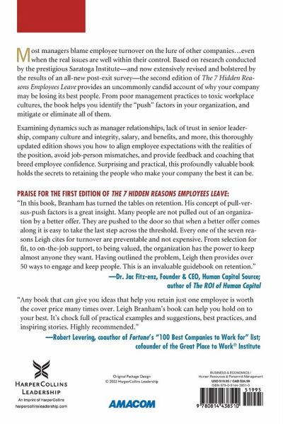 People are four times more likely to leave a job because of something going on in the office than for an outside opportunity. Employee engagement and retention expert Leigh Branham offers real solutions to help you overcome the costly problem of employee turnover. The book examines the factors that contribute to turnover--such as manager relationships, lack of trust in senior leadership, company culture, salary, and benefits--and teaches you how to navigate these obstacles and avoid them in the first place. In The 7 Hidden Reasons Employees Leave, you'll learn skills such as: aligning employee expectations with the realities of the position, avoiding job-person mismatches, and providing feedback and coaching that breed employee confidence. Now incorporating results from Branham's "Decision to Leave" post-exit survey, the second edition features new research in employee engagement as well as innovative best practices for retaining employees in a down economy. By revealing what can be done to hold on to the people who provide the most value to the organization, The 7 Hidden Reasons Employees Leave helps you increase their teams' morale, productivity--and the company's bottom line.