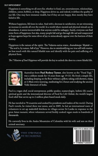 Happiness is something we all crave for, whether in food, sex, entertainment, relationships, children, career, hobbies, or sleep. Happiness drives us, and indeed, it defines the quality of our life. One may have immense wealth, but if they are not happy, then mostly they have failed in life. Without happiness, life loses its value. And with a decrease in satisfaction, we are witnessing an increase in suicide all over the world. In a world where mental and physical stimuli are in abundance, it seems inconceivable that anyone could be unhappy. Surely, everyone can find some form of happiness, but alas, many people fail and go through life sad and exasperated or hope against hope for some sliver of joy to miraculously appear over the horizon of their destiny. Happiness is the nature of the spirit. The Vedanta-sutras states, Anandamayo 'bhyasat- "The soul is, by nature, full of joy." However, due to misidentifying our true self with matter, we lose touch with this natural blissful state and identify with the pain and suffering of a physical form. The 7 Maxim of Soul Happiness will provide the key to unlock the door to a more blissful life.