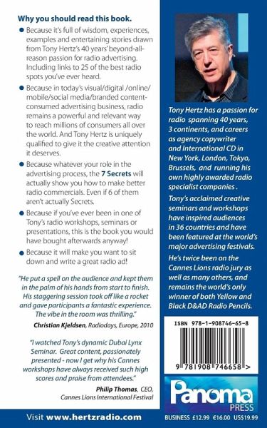Why you should read this book: because it's full of wisdom, experiences, examples and entertaining stories drawn from Tony Hertz's 40 years' beyond-all reason passion for radio advertising. Including links to 25 of the best radio spots you've ever heard. Because in today's visual/digital /online/mobile/social media/branded content consumed advertising business, radio remains a powerful and relevant way to reach millions of consumers all over the world. And Tony Hertz is uniquely qualified to give it the creative attention it deserves. Because whatever your role in the advertising process, the 7 Secrets will actually show you how to make better radio commercials. Even if 6 of them aren't actually Secrets. Because if you've ever been in one of Tony's radio workshops, seminars or presentations, this is the book you would have bought afterwards anyway! Because it will make you want to sit down and write a great radio ad!