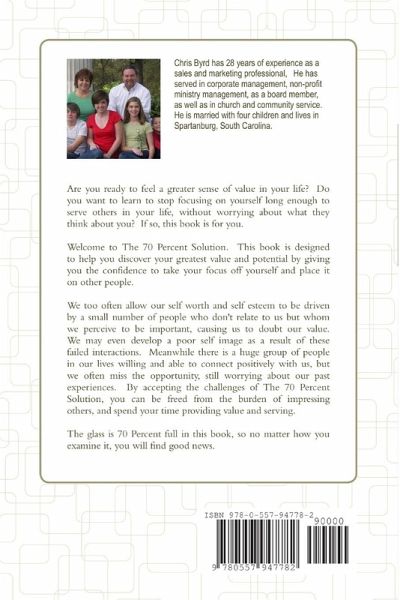 Are you ready to feel a greater sense of value in your life? Do you want to learn to stop focusing on yourself long enough to serve others in your life, without worrying about what they think about you? Welcome to The 70 Percent Solution. This book is designed to help you discover your greatest value and potential by giving you the confidence to take your focus off yourself and place it on other people. We too often allow our self worth and self esteem to be driven by a small number of people who don't relate to us but whom we perceive to be important, causing us to doubt our value. We may even develop a poor self image as a result of these failed interactions. Meanwhile there is a huge group of people in our lives willing and able to connect positively with us, but we often miss the opportunity, still worrying about our past experiences. By accepting the challenges of The 70 Percent Solution, you can be freed from the burden of impressing others, and spend your time providing value and serving.