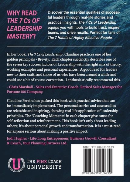 Why read The 7Cs of Leadership Mastery? Discover the essential qualities of successful leaders through real-life stories and practical insights. The 7Cs of Leadership equips you with tools to build trust, inspire teams, and drive results. Perfect for fans of The 7 Habits of Highly Effective People. "In her book, The 7Cs of Leadership, Claudine practices one of her golden principals, Brevity. Each well-constructed paragraph succinctly describes one of the seven key success factors of Leadership with the right and consistent mix of theory, working examples and personal experiences. The concepts make sense and are a good read for leaders new to their craft, and those of us who have been around a while and could use a bit of course correction. I enthusiastically recommend this" --Chris Marshall - Sales and Executive Coach, Retired Sales Manager for Fortune 100 Company "At the beginning of her book, Claudine references: "Leadership - the capacity to lead; the ability to guide, direct, or influence others." This was my reminder that we all have a leadership role to play. Claudine Pereira has packed this book with practical advice that can be immediately implemented. The personal stories and case studies are relatable and inspiring, showing real-life application of leadership principles. The 'Coaching Moments' in each chapter give cause for self-reflection and reinforcement. This book isn't only about leading others; it's about personal growth and transformation. It is a must-read for anyone serious about making a positive impact" --Judi Hughes - Life-Long Entrepreneur Business Growth Consultant & Coach, Your Planning Partners Ltd.