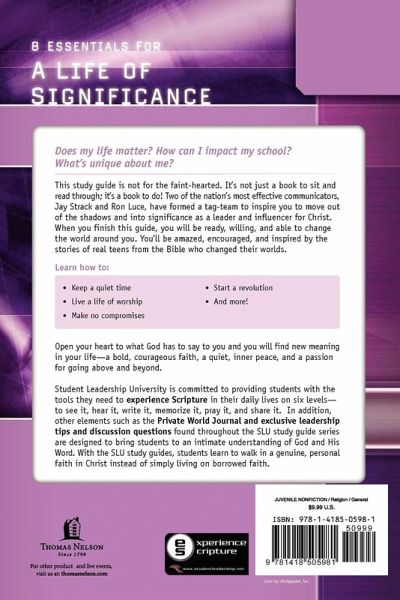 For over 20 years, Dr. Jay Strack has been working with young Christian leaders throughout the U.S. and teaching them have a better understanding of God's Word and His calling in their lives. The topics chosen for the Student Leadership University Study Guide Series represent part of the teaching model that Dr. Strack has developed over the years and address tough questions that young people are asking today. In this study guide, Dr. Strack and Ron Luce will take the student on a journey through the lives of teens such as David, Joseph, Shadrach, Meshach, and Abednego, Timothy, Mary, and others to discover what it takes to really make a difference in the world around you. They will teach students the importance of: having a powerful personal devotion time with God / keeping your mind protected and fortified / defending your faith / having accountability / honoring your parents / finding your purpose and living it out fearlessly