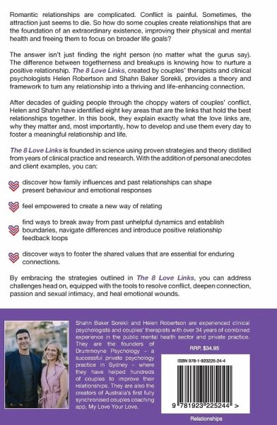 Romantic relationships are complicated. Conflict is painful. Sometimes, the attraction just seems to die. So how do some couples create relationships that are the foundation of an extraordinary existence, improving their physical and mental health and freeing them to focus on broader life goals? The answer isn't just finding the right person (no matter what the gurus say). The difference between togetherness and breakups is knowing how to nurture a positive relationship. The 8 Love Links, created by couples' therapists and clinical psychologists Helen Robertson and Shahn Baker Sorekli, provides a theory and framework to turn any relationship into a thriving and life-enhancing connection. After decades of guiding people through the choppy waters of couples' conflict, Helen and Shahn have identified eight key areas that are the links that hold the best relationships together. In this book, they explain exactly what the love links are, why they matter and, most importantly, how to develop and use them every day to foster a meaningful relationship and life. The 8 Love Links is founded in science using proven strategies and theory distilled from years of clinical practice and research. With the addition of personal anecdotes and client examples, you can: discover how family influences and past relationships can shape present behaviour and emotional responses feel empowered to create a new way of relating find ways to break away from past unhelpful dynamics and establish boundaries, navigate differences and introduce positive relationship feedback loops discover ways to foster the shared values that are essential for enduring connections. By embracing the strategies outlined in The 8 Love Links, you can address challenges head on, equipped with the tools to resolve conflict, deepen connection, passion and sexual intimacy, and heal emotional wounds.