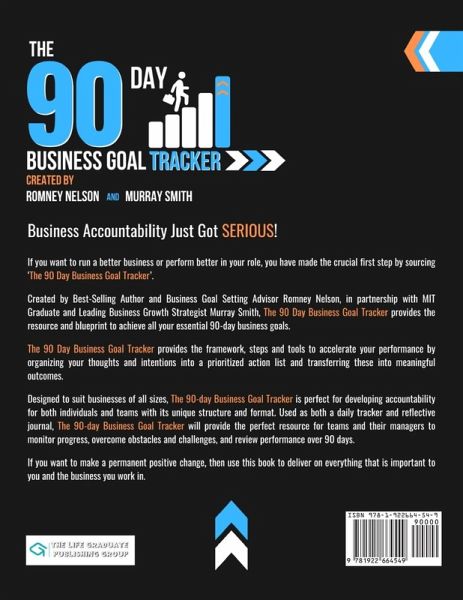 If you want to run a better business or perform better in your role, you have made the crucial first step by sourcing 'The 90 Day Business Goal Tracker'. Created by MIT Graduate and Leading Business Growth Strategist Murray Smith and Best-Selling Author R.T Nelson, The 90 Day Business Goal Tracker provides the resource and blueprint to achieve all your essential 90 day business goals. The 90 Day Business Goal Tracker provides the framework, steps and tools to accelerate your performance by organizing your thoughts and intentions into a prioritized action list and transferring these into meaningful outcomes. Designed to suit businesses of all sizes, The 90 Day Business Goal Tracker is perfect for developing accountability for both individuals and teams with its unique structure and format. Used as both a daily tracker and reflective journal, The 90 Day Business Goal Tracker will provide the perfect resource for teams and their managers to monitor progress, overcome obstacles and challenges, and review performance over 90 days. Product Description:· 8.5 x 11 inch - Perfect journal size for daily entries· 200+ pages - Includes all key details, steps and daily tracking templates· Gloss Cover - For added durability If you want to make a permanent positive change, then use this book to deliver on everything that is important to you and the business you work in.