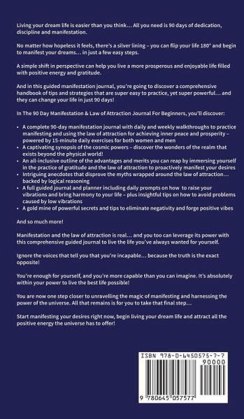 Living your dream life is easier than you think... All you need is 90 days of manifestation, focus and discipline to unlock the secret power of the law of attraction! Life can be tough and sometimes you can feel hopeless that you are not in control of your future. But no matter how desperate your situation gets, there is a silver lining - you can flip your life 180° and begin to manifest and live the life of your dreams ... in just a few easy steps. A simple shift in perspective can help you live a more prosperous and enjoyable life filled with positive energy and gratitude. In this guided manifestation journal, you're going to discover a comprehensive handbook of tips and strategies that are super easy to practice, yet super powerful... and they can change your life in just 90 days! In The 90 Day Manifestation & Law of Attraction Journal For Beginners you'll discover: A complete 90-day manifestation journal with daily and weekly walkthroughs to practice manifesting and using the law of attraction for achieving inner peace and prosperity - powered by 15-minute daily exercises for both women and men A captivating synopsis of the cosmic powers - discover the wonders of the realm that exists beyond the physical world! An all-inclusive outline of the advantages and merits you can reap by immersing yourself in the practice of gratitude and the law of attraction to proactively manifest all your desires Intriguing anecdotes that disprove the myths wrapped around the law of attraction... backed by logical reasoning A full guided manifestation journal and planner including daily prompts on how to raise your vibrations and bring harmony into your life - plus insightful tips on how to avoid problems caused by low vibrations A gold mine of powerful secrets and tips to eliminate negativity and forge positive vibes And so much more! Manifestation and the law of attraction is real... and you too can leverage its power with this comprehensive guided manifestation journal to live the life you've always wanted for yourself! Ignore the voices that tell you that you're incapable... because the truth is the exact opposite. You're enough for yourself, and you're more capable than you can imagine. It's absolutely within your power to live the best life possible! You are now one step closer to unravelling the magic of manifesting and harnessing the power of the universe. All that remains is for you to take that final step... If you want to start manifesting your desires, begin living your dream life and attract all the positive energy the universe has to offer, then scroll up and click the "Add to Cart" button right now!