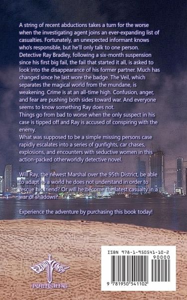 A string of recent abductions takes a turn for the worse when the investigating agent joins an ever-expanding list of casualties. Fortunately, an unexpected informant knows who's responsible, but he'll only talk to one person. Detective Ray Bradley, following a six-month suspension since his first big fail, the fail that started it all, is asked to look into the disappearance of his former partner. Much has changed since he last wore the badge. The Veil, which separates the magical world from the mundane, is weakening. Crime is at an all-time high. Confusion, anger, and fear are pushing both sides toward war. And everyone seems to know something Ray does not. Things go from bad to worse when the only suspect in his case is tipped off and Ray is accused of conspiring with the enemy. What was supposed to be a simple missing persons case rapidly escalates into a series of gunfights, car chases, explosions, and encounters with seductive women in this action-packed otherworldly detective novel. Will Ray, the newest Marshal over the 95th District, be able to adapt to a world he does not understand in order to rescue his friend? Or will he become the latest casualty in a war of shadows? Experience the adventure by purchasing this book today!