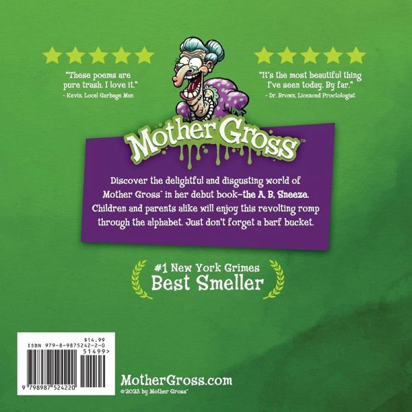 The A, B, Sneeze is the debut children's picture book written and illustrated by Mother Gross. It's a revolting romp through the alphabet that highlights some of the most disgusting and delightful words in the English language. Children and parents alike will enjoy these wretched rhymes and gross graphics. You know, when they're not busy gagging.