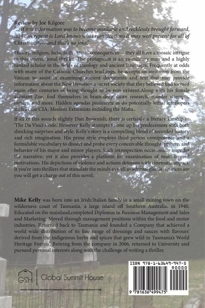 Review by Joe Kilgore "... if this information was to become available and recklessly brought forward, all i can repeat is Lord knows what ramifications it may well present for all of Christianity---and that's no joke." History, religion, facts, faith , truth, consequences--- they all have a mosaic intrigue in this international thriller. The protagonist is an ex-military man and a highly ranked scholar in the fields of theology and ancient languages. Frequently at odds with many of the Catholic Churches teachings, he accepts an invitation from the Vatican to assist in examining ancient documents and text that may provide information about the New Devotion a secret society that they believed had formed again after centuries of being thought to be non-existent.Along with his female assistant Zoe, find themselves in brain-deep dusty research, murder attempts, torture, and more. Hidden agendas proliferate as do potentially lethal interlopers such as the CIA, Moslem Extremists including the Mafia.. If all of this sounds slightly Dan Brownish, there is certainly a literary kinship to 'The Da Vinci Code.' However Kelly attempts to one-up his predecessors with both shocking surprises and style. Kelly's story is a compelling blend of recorded history and rich imagination. His prose style employs third-person omnipotence and a formidable vocabulary to dissect and probe every conceivable thought, gesture, and behavior of his major and minor players. Such introspection occasionally impedes the narrative, yet it also provides a platform for examination of multi-layered motivations. His depictions of violence and actions detonate with cinematic impact. If you're into thrillers that stimulate the minds as well as adrenal glands, chances are you will get a charge out of this novel.