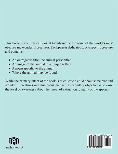 This book is a whimsical look at twenty-six of the some of the world's most obscure and wonderful creatures. Each page is dedicated to one specific creature and contains: An outrageous title: the animal personified An image of the animal in a unique setting A poem specific to the animal Where the animal may be found While the primary intent of the book is to educate a child about some rare and wonderful creatures in a humorous manner, a secondary objective is to raise the level of awareness about the threat of extinction to many of the species.