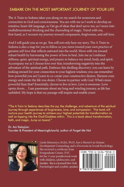 EMBARK ON THE MOST IMPORTANT JOURNEY OF YOUR LIFE The A Train to Sedona takes you along on my search for awareness and connection to God and consciousness. You are with me as I work to develop an intuitive, heart-felt language, as I let go of ideas that don't serve me, as I move into multidimensional thinking and the channeling of magic. Travel with me, first-hand, as I recount my journey toward compassion, forgiveness, and self-love. And I will guide you as we go. You will not only hear my story. The A Train to Sedona is also a map for you to follow as you move toward your own practice of genuine self-love that reflects outward into the world. Move with me toward robust health by harnessing the power of love to heal. Join me as I embrace stillness, quiet, spiritual energy, and prayer, to balance my mind, body, and spirit. Accompany me as I choose love over fear, transforming negativity into the adventure of the spiritual path. Embrace this thrilling discovery: you can learn by looking inward for your connection to your highest wisdom; you can remember how powerful you are! Learn to co-create your constructive desires. Harness your energy and create the life you desire. Choose to partner with God. What's more powerful than that? Essentially, choose to live in love. Love is awesome. Love opens doors... I am passionate about my long and winding journey, as life has unfolded. My hope is that my passage will inspire and enable yours The A Train to Sedona, describes the joy, the challenge, and adventure of the spiritual journey through experiences of forgiveness, love, and compassion. This book will nurture your health journey to achieve your highest potentials for transformation, as well as well as tapping into the God/Goddess within. This is a book about transformation, faith, and magic. Jump on board. Dr. Ani Kalayjia Founder & President of Meaningfulworld, author of Forget Me Not Using practical examples taken from real-life situations, and citing major traditions and beliefs such as Buddhism, as well as accessing contemporary and past thinkers, scientists, life coaches and spiritual leaders, Linda Marsanico guides the reader along the path of self-awareness by describing and analyzing her own life decisions, her strategies for dealing with fear, and her epiphanies when experiencing the power of self-love. Marsanico's book is written in a warm, friendly style for those seeking to experience peace and growth spiritually, mentally, physically, and emotionally by shedding negative energy and creating positive energy. Michael O'Brien Browne, Transformational life-coach & award-winning author
