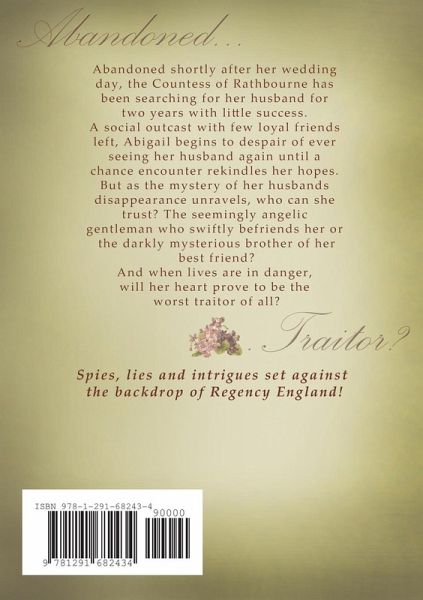 Abandoned shortly after her wedding day, the Countess of Rathbourne has been searching for her husband for two years with little success. A social outcast with few loyal friends left, Abigail begins to despair of ever seeing her husband again until a chance encounter rekindles her hopes. But as the mystery of her husbands disappearance unravels, who can she trust? The seemingly angelic gentleman who swiftly befriends her or the darkly mysterious brother of her best friend? And when lives are in danger, will her heart prove to be the worst traitor of all? Spies, lies and intrigues set against the backdrop of Regency England!
