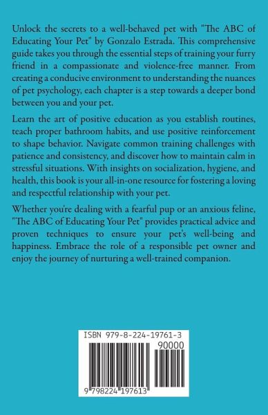 Unlock the secrets to a well-behaved pet with "The ABC of Educating Your Pet" by Gonzalo Estrada. This comprehensive guide takes you through the essential steps of training your furry friend in a compassionate and violence-free manner. From creating a conducive environment to understanding the nuances of pet psychology, each chapter is a step towards a deeper bond between you and your pet. Learn the art of positive education as you establish routines, teach proper bathroom habits, and use positive reinforcement to shape behavior. Navigate common training challenges with patience and consistency, and discover how to maintain calm in stressful situations. With insights on socialization, hygiene, and health, this book is your all-in-one resource for fostering a loving and respectful relationship with your pet. Whether you're dealing with a fearful pup or an anxious feline, "The ABC of Educating Your Pet" provides practical advice and proven techniques to ensure your pet's well-being and happiness. Embrace the role of a responsible pet owner and enjoy the journey of nurturing a well-trained companion.