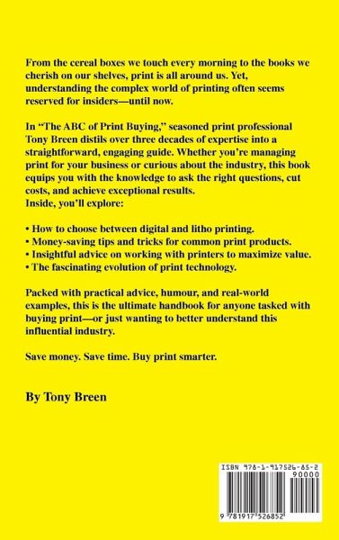 Discover the world of printing with The ABC of Print Buying, a practical guide for anyone looking to save money and achieve better results when purchasing print. Whether you're a business owner, marketing professional, or simply curious about how print works, this book makes a seemingly complex industry easy to understand. Written by Tony Breen, a print industry veteran with over three decades of experience, this book is packed with straightforward advice, helpful tips, and real-world insights. Tony breaks down the mysteries of printing-from artwork preparation to paper choices, from colour matching to specialist finishing processes. The aim is simple: to help you ask the right questions, make informed decisions, and avoid common pitfalls that could cost you time and money. You'll explore the basics of printing methods, including litho and digital printing, and understand when to choose one over the other. You'll also gain insights into practical areas like pagination, business card design, and stationery purchasing, with actionable tips to ensure you get value for money. Tony's approachable style and humour make this guide enjoyable and easy to follow, even if you have no prior knowledge of printing. He simplifies technical jargon, shares amusing anecdotes from his career, and gives you the tools to work confidently with printers and designers. Whether your business spends £5,000 or £50,000 a year on print, this book is your essential companion for smarter, more cost-effective print buying. The ABC of Print Buying is a must-read for anyone who wants to master the art of getting the best out of their printing projects. Take control of your print purchases today and uncover the secrets to beautiful, professional, and budget-friendly results!