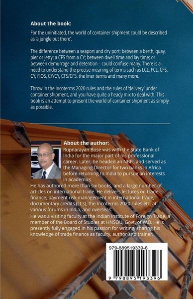 About the book For the uninitiated, the world of container shipment could be described as 'a jungle out there'. The difference between a seaport and dry port; between a berth, quay, pier or jetty; a CFS from a CY; between dwell time and lay time; or between demurrage and detention - could confuse many. There is a need to understand the precise meaning of terms such as LCL, FCL, CFS, CY, FIOS, CY/CY, CFS/CFS, the liner terms and many more. Throw in the Incoterms 2020 rules and the rules of 'delivery' under container shipment, and you have quite a heady mix to deal with. This book is an attempt to present the world of container shipment as simply as possible.