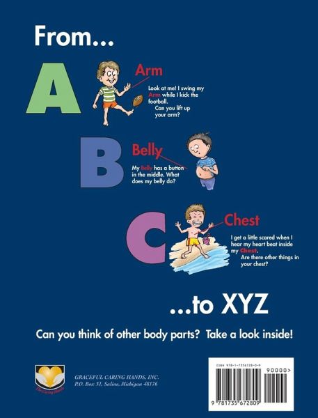 This book is an opportunity to share with you our experience of teaching our baby, names of her external body parts. We would touch our nose, mouth, eyes and other body parts, naming them and touching our baby's similar parts, repeating the names. This became a fun game that led to the idea of developing a simpler way to make her remember. When we started teaching our baby the alphabet; A is for "Antelope", B is for "Basket"..., we came up with the idea to link all parts of the body to ABC's. We decided to document this experience in a book and asked Thomas Petiet if he would be interested in illustrating a book with this theme. He showed great enthusiasm and went to work right away. His love of art and personal experience as a father and grandfather are displayed in this book. We are thankful for his encouragement, artistry, arrangement, patience, sacrifice and other contributions to the production of this book. It is our hope that this format of teaching the Human Body parts in artistic form and inserting their functions and questions for conversation, would stimulate greater interest in children's learning of their unique bodies. We would encourage parents, grandparents, family members, teachers and others to engage with children and use this book as a teaching tool for kids. Children would be enriched by the detailed knowledge of their body parts and functions.
