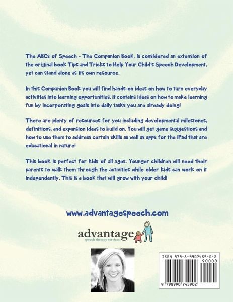 The ABCS of Speech - The Companion Book, is considered an extension of the original book Tips and Tricks to Help Your Child's Speech Development, yet can stand alone as its own resource. In this Companion Book you wil find hands-on ideas on how to turn everyday activities into learning opportunities. It contains ideas on how to make learning fun by incorporating goals into daily tasks you are already doing! There are plenty of resources for you including developmental milestones, definitions, and expansion ideas to build on. You wil get game suggestions and how to use them to address certain skills as well as apps for the iPad that are educational in nature! This book is perfect for kids of al ages. Younger children wil need their parents to walk them through the activities while older kids can work on it independently. This is a book that wil grow with your child!