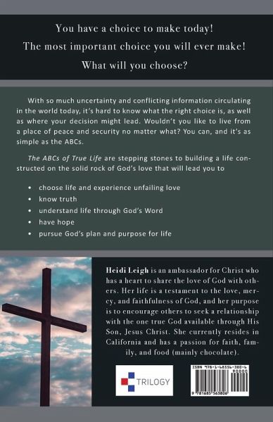 You have a choice to make today! The most important choice you will ever make! What will you choose? With so much uncertainty and conflicting information circulating in the world today, it's hard to know what the right choice is, as well as where your decision might lead. Wouldn't you like to live from a place of peace and security no matter what? You can, and it's as simple as the ABCs.The ABCs of True Life are stepping stones to building a life constructed on the solid rock of God's love that will lead you to choose life and experience unfailing love know truth understand life through God's Word have hope pursue God's plan and purpose for life