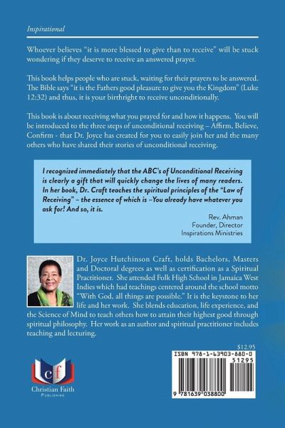 Whoever believes "it is more blessed to give than to receive" will be stuck wondering if they deserve to receive an answered prayer. This book helps people who are stuck waiting for their prayers to be answered. The Bible says, "It is the Father's good pleasure to give you the kingdom" (Luke 12:32). Thus, it is your birthright to receive unconditionally.This book is about receiving what you prayed for and how it happens. You will be introduced to the three steps of unconditional receiving that Dr. Joyce has created for you to easily join her and the many others who have shared their stories of unconditional receiving.Dr. Joyce Hutchinson Craft holds bachelor's, master's, and doctoral degrees as well as certification as a spiritual practitioner. She attended Folk High School in Jamaica, West Indies, which had teachings centered around the school motto, "With God, all things are possible." It is the keystone to her life and her work. She blends education, life experience, and the Science of Mind to teach others how to attain their highest good through spiritual philosophy. Her work as an author and spiritual practitioner includes teaching and lecturing.