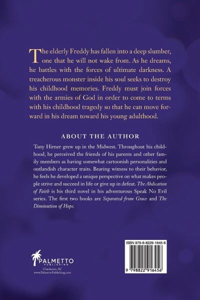 While the elderly Freddy falls into a deep sleep that he will not wake from, the forces of darkness seek to destroy his childhood memories. The armies of heaven and hell clash over his soul. As Freddy sleeps, he battles for his soul. A treacherous, hungry monster lurks in the shadows of his mind and attacks his childhood memories. To overcome the tragedy of his childhood, Freddy must join with the armies of God and drive away the darkness. Only then can Freddy move past his childhood memories to his young adulthood where even more terrifying monsters await him. Meanwhile, the courageous Faith fights against the plots of Lucifer, who seeks to destroy the angel Nathan in his ongoing challenge against God. All the forces of heaven and hell clash and battle in this supernatural thriller of epic proportions. The Abdication of Faith is a timeless story about the battle between the ultimate forces of good and evil. Fans of supernatural stories with angels, demons, the armies of God, and the powers of Lucifer will be thrilled to open its pages. Readers who want determined characters who fight hard for what they believe in may find Freddy and Faith the ideal heroes they have been searching for. The Abdication of Faith continues the harrowing adventure of the Speak No Evil series.