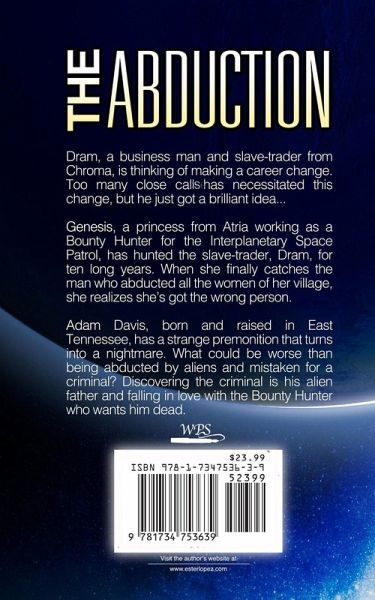 Dram, a businessman and slave-trader is thining of making a career change. Too many close calls necessitate this change and his long-time business partner just died in a crash. The one person he came to find on Earth has just walked into his life. Can this get any better? Genesis, a princess from Atria working as a Bounty Hunter for the Inter Planetary Space Patrol, has hunted Dram for ten long years, When she finally catches the man who abducted all the women of her village, she realizes too late, she's got the wrong person. Can anything else go wrong? Adam Davis, born and raised in east Tennessee, just had a strange premonition that turns into a nightmare. He's a resourceful loner that is mistaken for a criminal and abducted by aliens. He thought that was bad enough until he discovered the criminal he was mistaken for is his alien father. Then, to top it off, he falls for the beautiful Bounty Hunter who has hated his face for years and she's wanted him dead for the past ten. After helping her find and rescue her father like he promised, will she return him to Earth like she promised? Once she returns him to Earth, can he let her go? Or can he have a life with Genesis in another universe an be happy?