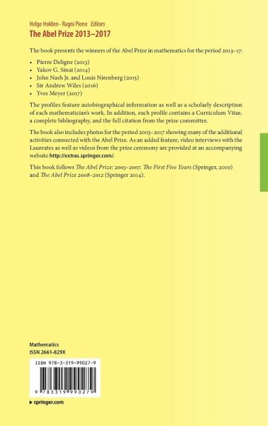 The book presents the winners of the Abel Prize in mathematics for the period 2013-17: Pierre Deligne (2013); Yakov G. Sinai (2014); John Nash Jr. and Louis Nirenberg (2015); Sir Andrew Wiles (2016); and Yves Meyer (2017).