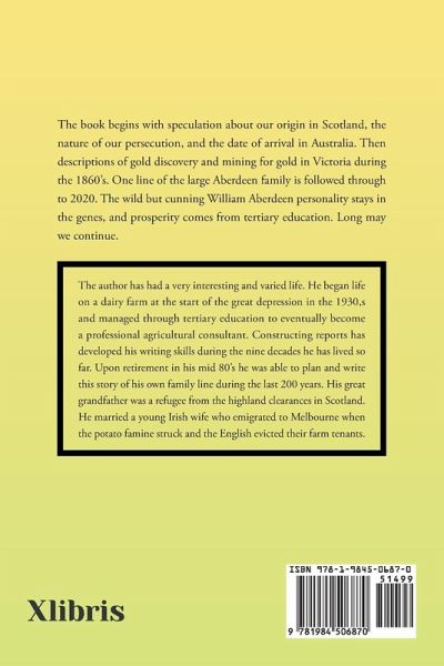 The book begins with speculation about our origin in Scotland, the nature of our persecution, and the date of arrival in Australia. Then descriptions of gold discovery and mining for gold in Victoria during the 1860's. One line of the large Aberdeen family is followed through to 2020. The wild but cunning William Aberdeen personality stays in the genes, and prosperity comes from tertiary education. Long may we continue.