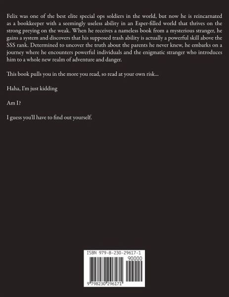 Felix was one of the best elite special ops soldiers in the world, but now he is reincarnated as a bookkeeper with a seemingly useless ability in an Esper-filled world that thrives on the strong preying on the weak. When he receives a nameless book from a mysterious stranger, he gains a system and discovers that his supposed trash ability is actually a powerful skill above the SSS rank. Determined to uncover the truth about the parents he never knew, he embarks on a journey where he encounters powerful individuals and the enigmatic stranger who introduces him to a whole new realm of adventure and danger. This book pulls you in the more you read, so read at your own risk... Haha, I'm just kidding Am I? I guess you'll have to find out yourself.