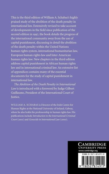 This is the third edition of William A. Schabas's highly praised study of the abolition of the death penalty in international law. Extensively revised to take account of developments in the field since publication of the second edition in 1997, the book details the progress of the international community away from the use of capital punishment, discussing in detail the abolition of the death penalty within the United Nations human rights system, international humanitarian law, European human rights law and Inter-American human rights law. New chapters in the third edition address capital punishment in African human rights law and in international criminal law. An extensive list of appendices contains many of the essential documents for the study of capital punishment in international law. The Abolition of the Death Penalty in International Law is introduced with a Foreword by Judge Gilbert Guillaume, President of the International Court of Justice.