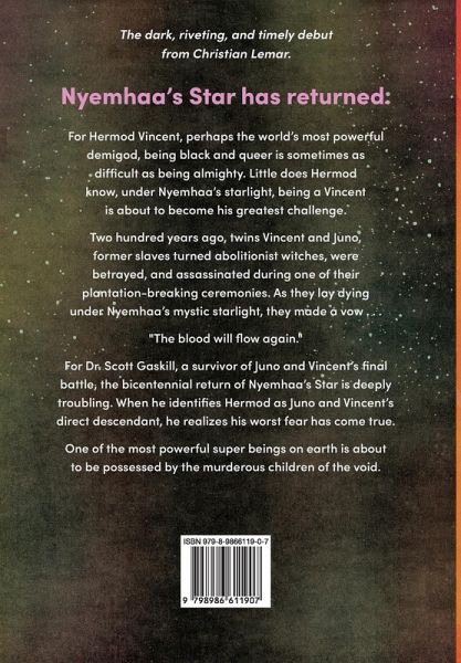 The dark, riveting, and timely debut from Christian Lemar. Nyemhaa's Star has returned. For Hermod Vincent, perhaps the world's most powerful demigod, being black and queer is sometimes as difficult as being almighty. Little does Hermod know, under Nyemhaa's starlight, being a Vincent is about to become his greatest challenge. Two hundred years ago, twins Vincent and Juno, former slaves turned abolitionist witches, were betrayed, and assassinated during one of their plantation-breaking ceremonies. As they lay dying under Nyemhaa's mystic starlight, they made a vow . . . "The blood will flow again." For Dr. Scott Gaskill, a survivor of Juno and Vincent's final battle, the bicentennial return of Nyemhaa's Star is deeply troubling. When he identifies Hermod as Juno and Vincent's direct descendant, he realizes his worst fear has come true. One of the most powerful super beings on earth is about to be possessed by the murderous children of the void.
