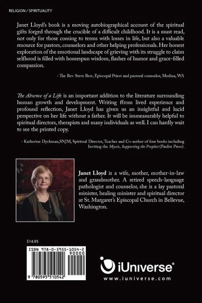 Janet Lloyd's book is a moving autobiographical account of the spiritual gifts forged through the crucible of a difficult childhood. It is a must read, not only for those coming to terms with losses in life, but also a valuable resource for pastors, counselors and other helping professionals. Her honest exploration of the emotional landscape of grieving with its struggle to claim selfhood is filled with homespun wisdom, flashes of humor and grace-filled compassion. - The Rev. Steve Best, Episcopal Priest and pastoral counselor, Medina, WA The Absence of a Life is an important addition to the literature surrounding human growth and development. Writing ffrom lived experience and profound reflection, Janet Lloyd has given us an insightful and lucid perspective on her life without a father. It will be immeasurably helpful to spiritual directors, therapists and many individuals as well. I can hardly wait to see the printed copy. - Katherine Dyckman,SNJM, Spiritual Director, Teacher and Co-author of four books including Inviting the Mystic, Supporting the Prophet (Paulist Press).