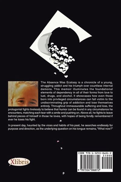 The Absence Was Ecstasy is a chronicle of a young, struggling addict and his triumph over countless internal demons. This memoir illuminates the foundational elements of dependency in all of their forms from love to lust, drugs, and alcohol. It showcases how even those born into privileged circumstances can fall victim to the undiscriminating grip of addiction and lose themselves entirely. Throughout immeasurable suffering and loss, the protagonist fights tirelessly to believe that humor can be found in any circumstance he encounters, matching each tear with a smile and pushing on. Above all, he fights to leave behind pieces of himself in those he loves, with hopes of being fondly remembered if ever he loses his fight. In present day, with a bleeding heart and a hopeless romantic, the narrator finds himself staring down at another lovers ghost. Haunted by the vices and habits of his past, he searches endlessly for purpose and direction, as the underlying question on his tongue remains, What now?