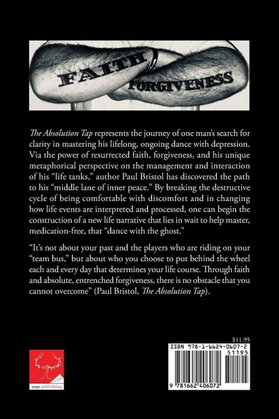 The Absolution Tap represents the journey of one man's search for clarity in mastering his lifelong, ongoing dance with depression. Via the power of resurrected faith, forgiveness, and his unique metaphorical perspective on the management and interaction of his "life tanks," author Paul Bristol has discovered the path to his "middle lane of inner peace." By breaking the destructive cycle of being comfortable with discomfort and in changing how life events are interpreted and processed, one can begin the construction of a new life narrative that lies in wait to help master, medication-free, that "dance with the ghost." "It's not about your past and the players who are riding on your "team bus," but about who you choose to put behind the wheel each and every day that determines your life course. Through faith and absolute, entrenched forgiveness, there is no obstacle that you cannot conquer" (Paul Bristol, The Absolution Tap).